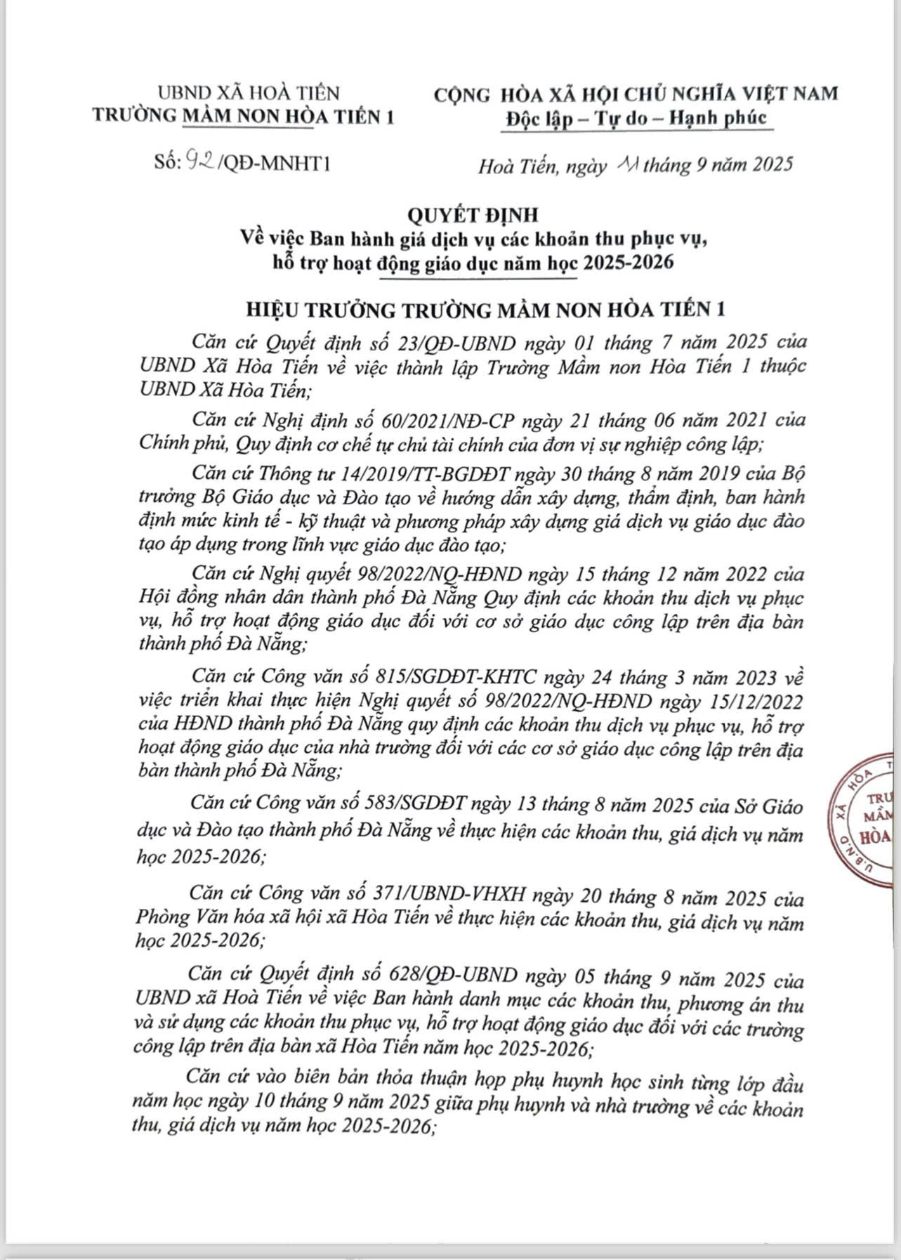 Quyết định ban hành giá dịch vụ các khoản thu phục vụ, hỗ trợ hoạt động giáo dục năm học 2025-2026
