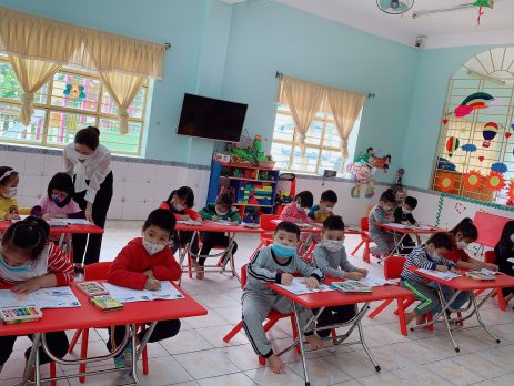 Các bạn lớp nhỡ 3 được nhận biết và làm quen với các chữ cái Nguồn: MN Hòa Tiến 1.