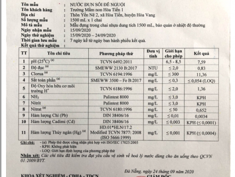 Trường MN Hòa Tiến 1 công khai kết quả xét nghiệm mẫu nước đun sôi để nguội năm học 2020 – 2021