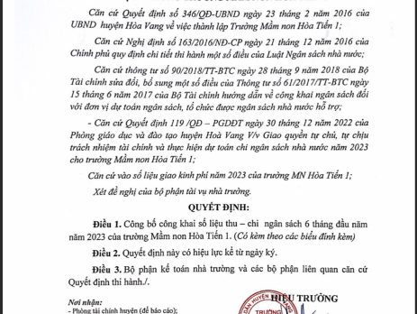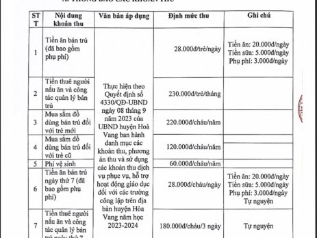 Thông báo các khoản thu và chính sách miễn giảm học phí, hỗ trợ chi phí học tập, hỗ trợ tiền ăn trưa năm học 2023-2023 Nguồn : Trường MN Hòa Tiến 1
