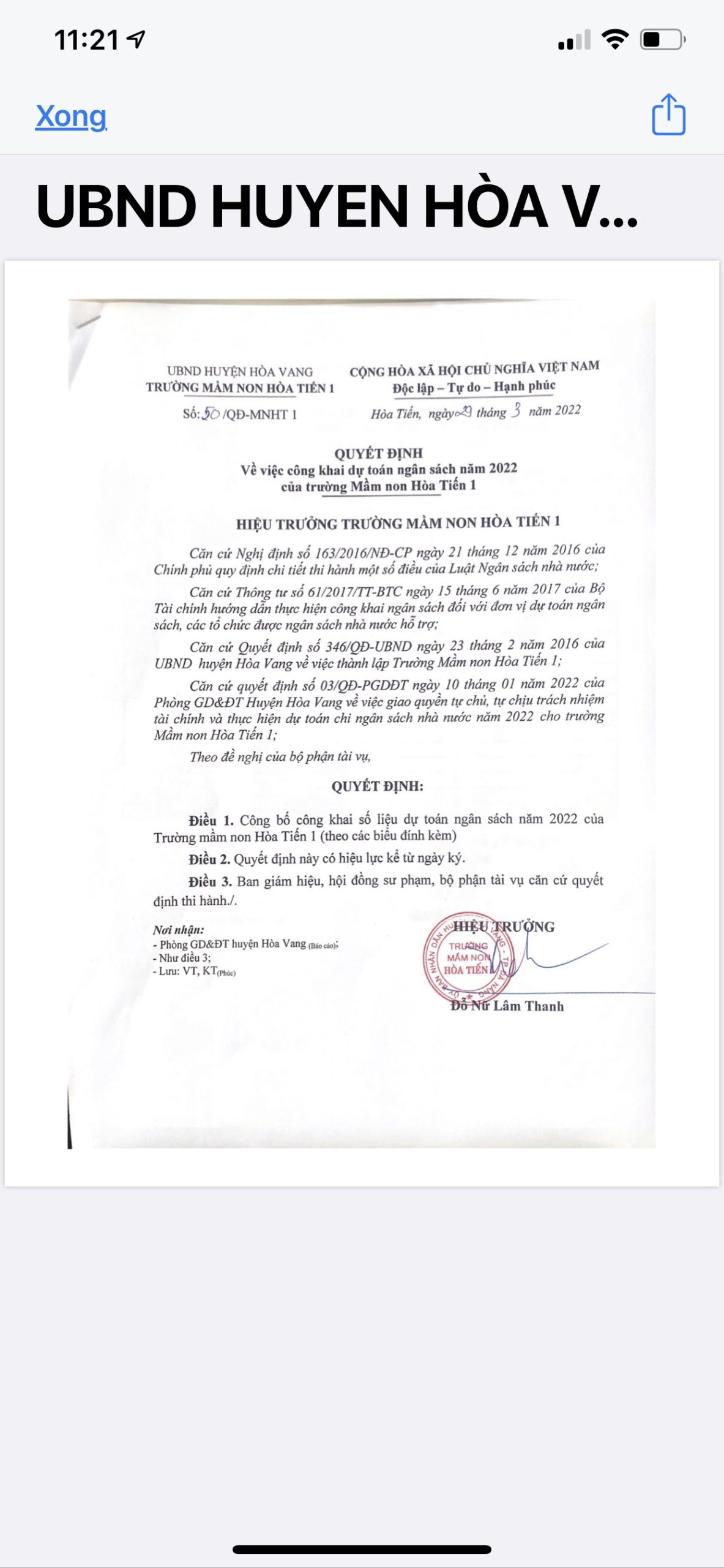 Trường mầm non Hòa Tiến 1 công khai dự toán ngân sách 2022.
