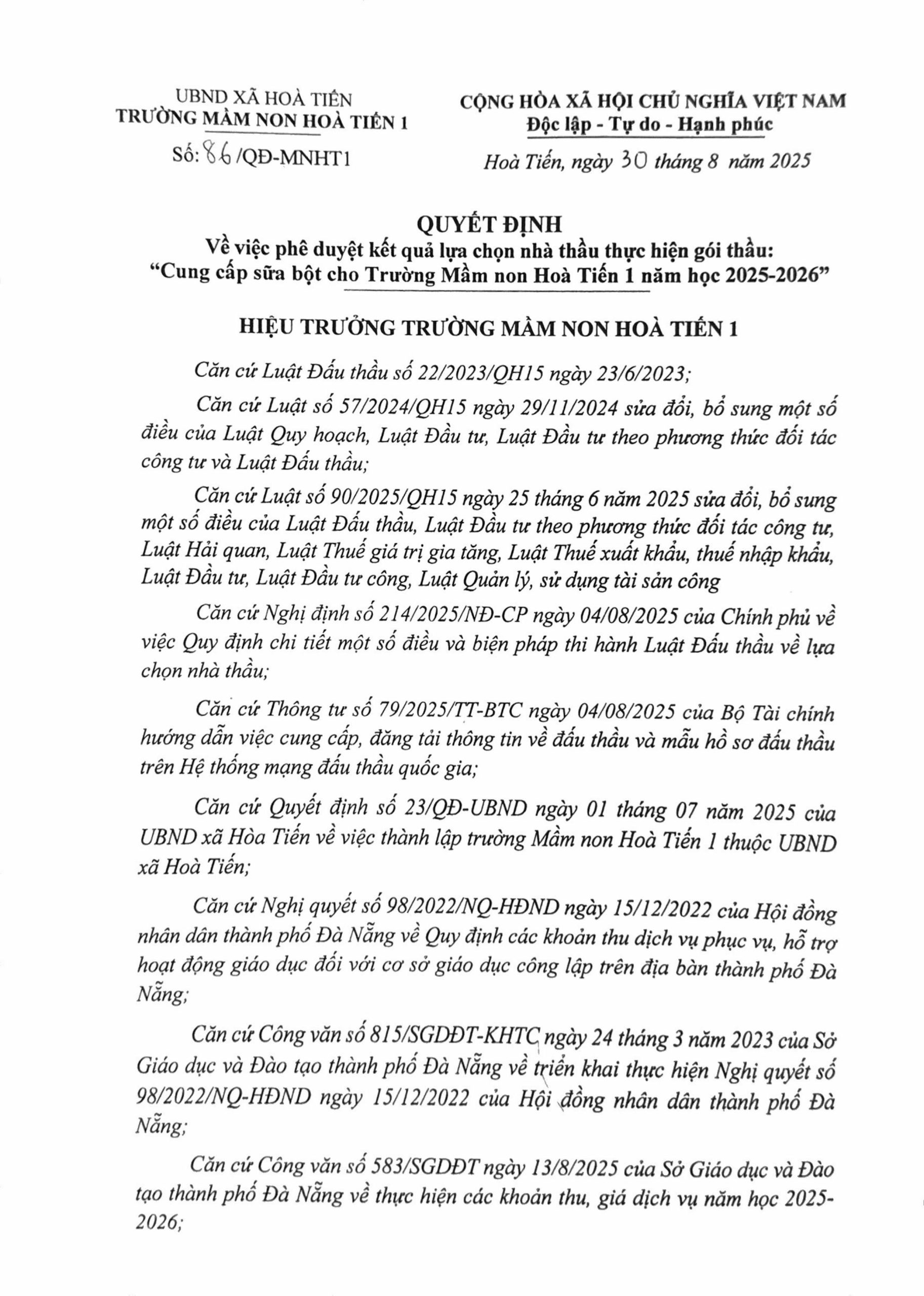 Công khai quyết định phê duyệt kết quả lựa chọn nhà thầu cung cấp thực phẩm, sữa năm học 2025-2026