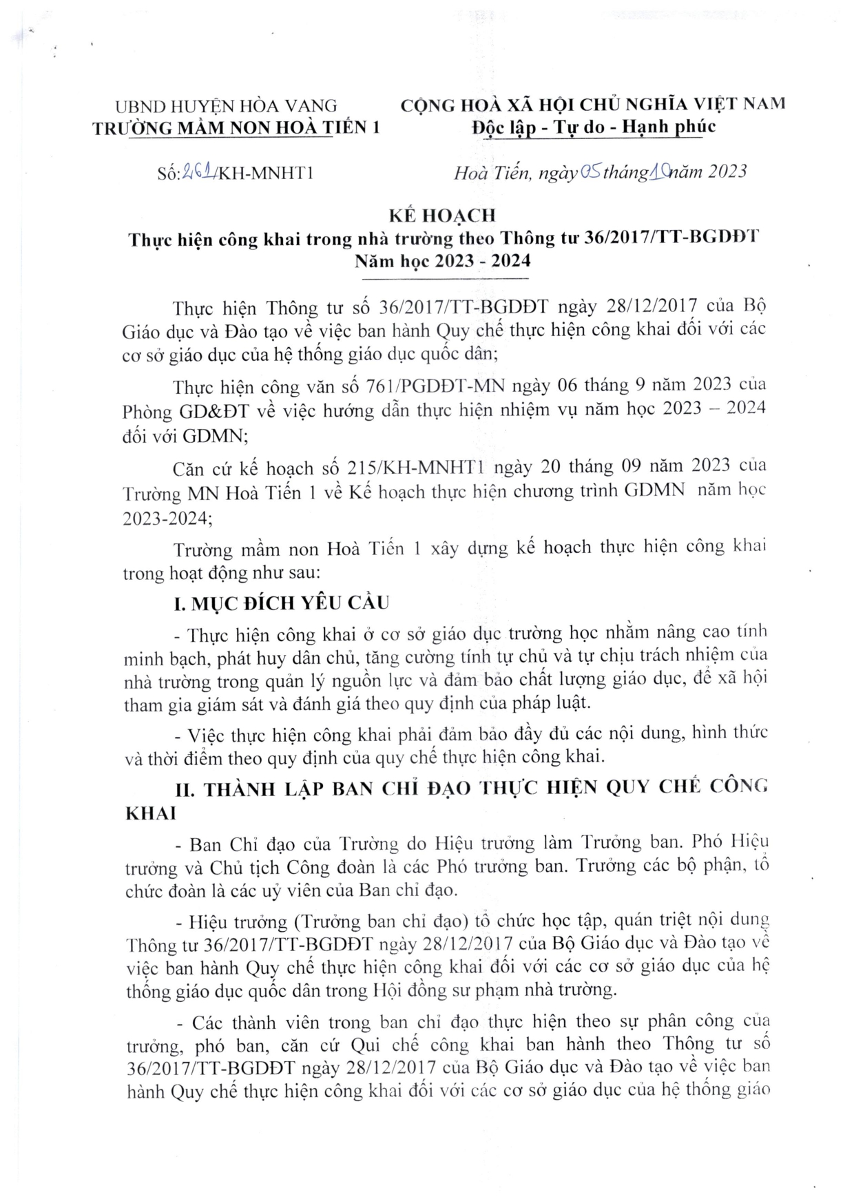 Kế hoạch thực hiện công khai trong nhà trường theo Thông tư 36/2017/TT-BGDĐT năm học 2023 – 2024