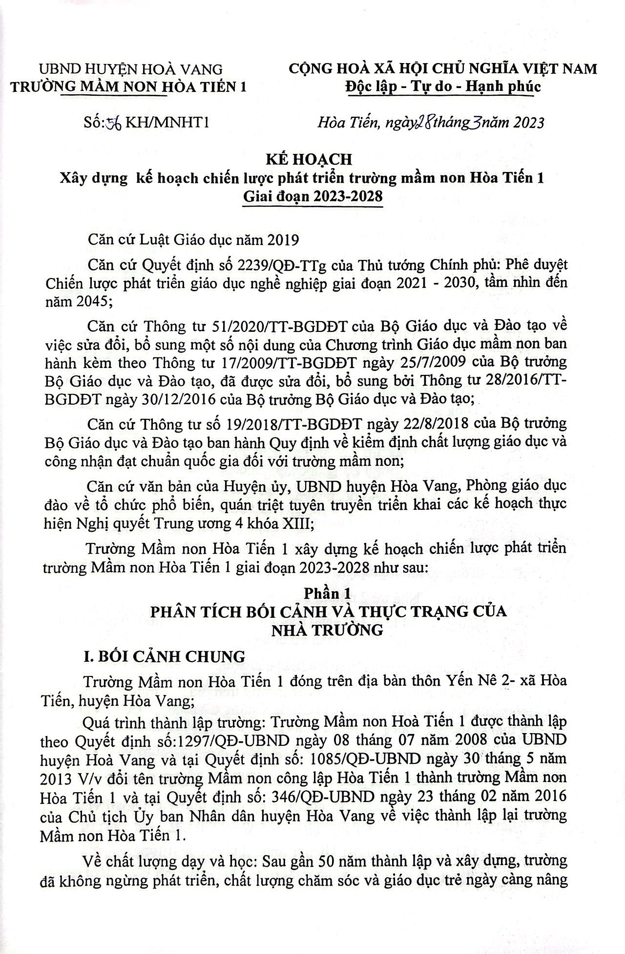 Kế hoạch xây dựng chiến lược phát triển Trường mầm non Hòa Tiến 1 giai đoạn 2023-2028