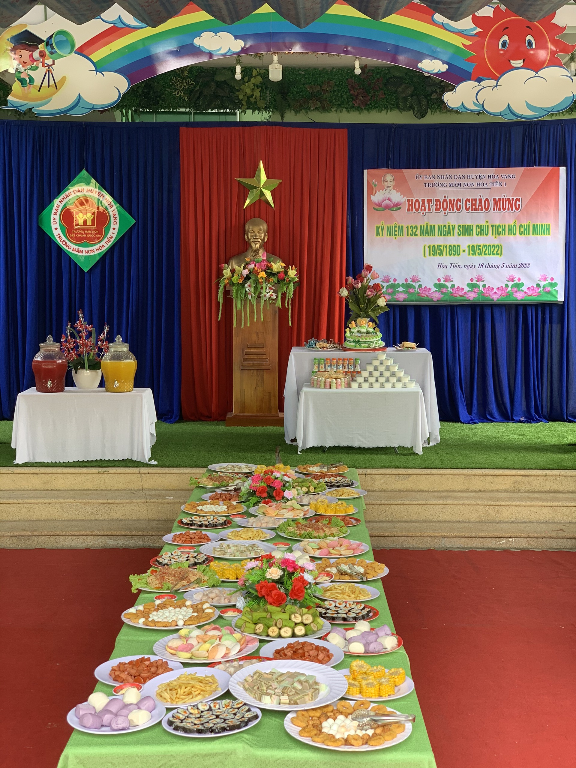 Ngày 18/05/2022, trường mầm non Hòa Tiến 1 tổ chức hoạt động chào mừng kỷ niệm 132 năm ngày sinh nhật Chủ tịch Hồ Chí Minh ( 19/05/1890 – 19/05/2022) và phối kết hợp cùng phụ huynh tổ chức tiệc Buffet cho trẻ toàn trường với nhiều món ăn đa dạng, phong phú, đảm bảo vệ sinh an toàn thực phẩm.