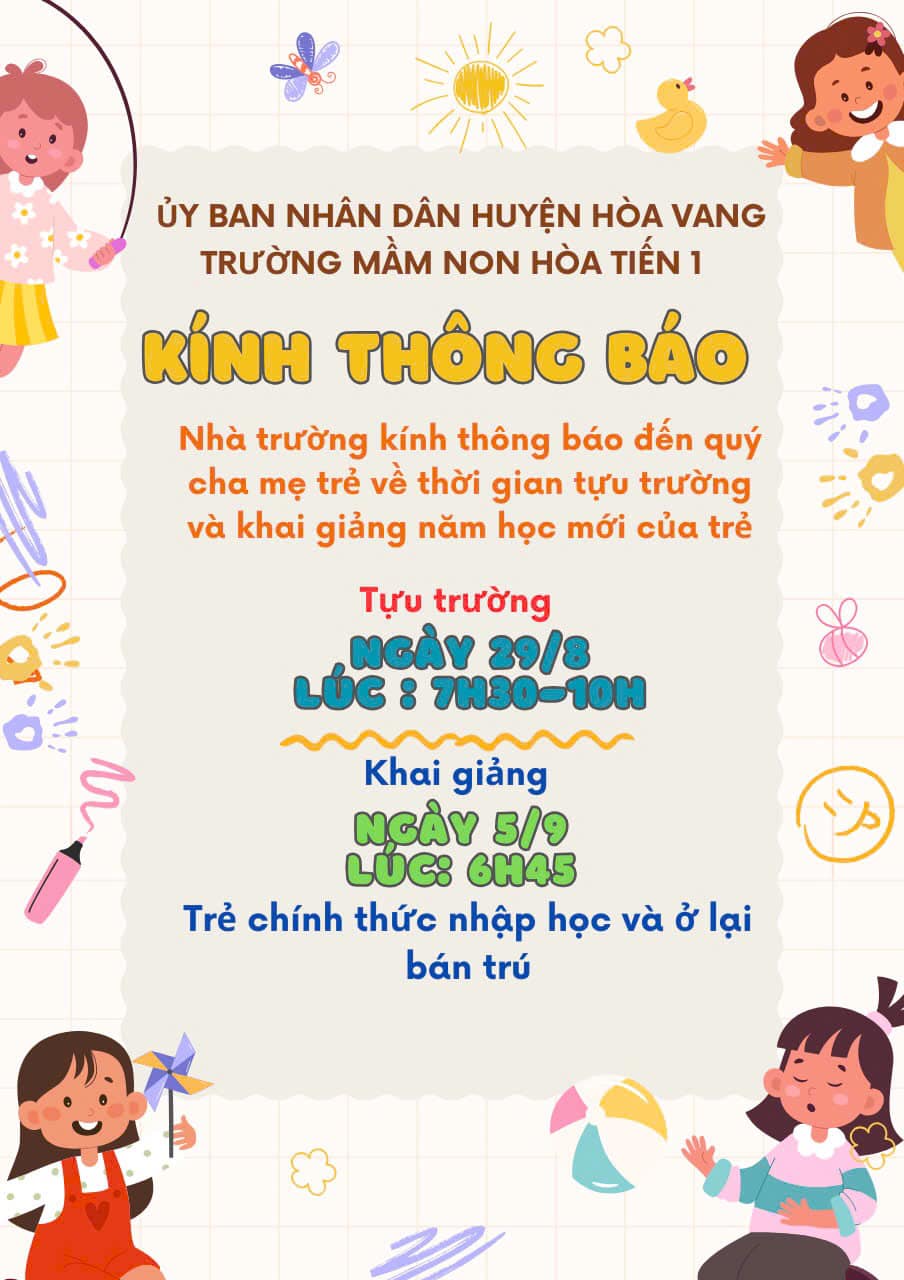 Trường Mầm non Hòa Tiến 1 kính thông báo đến quý phụ huynh về Lịch tựu trường và Lễ khai giảng năm học 2024-2025