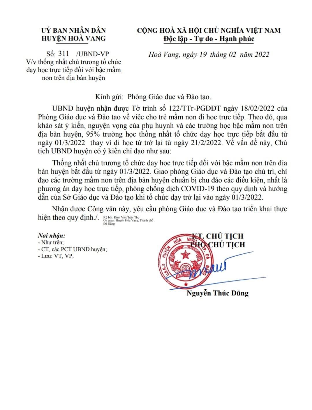 Trường Mần Non Hòa Tiến 1 thông báo đến quý phụ huynh về thời gian cho trẻ đi học trở lại trường học trực tiếp vào ngày 01/03/2022 theo công văn số 311 ngày 19/02/2022 của UBND Huyện Hòa Vang về việc thống nhất chủ trương dạy học trực tiếp đối với bậc học mầm non trên địa bàn.