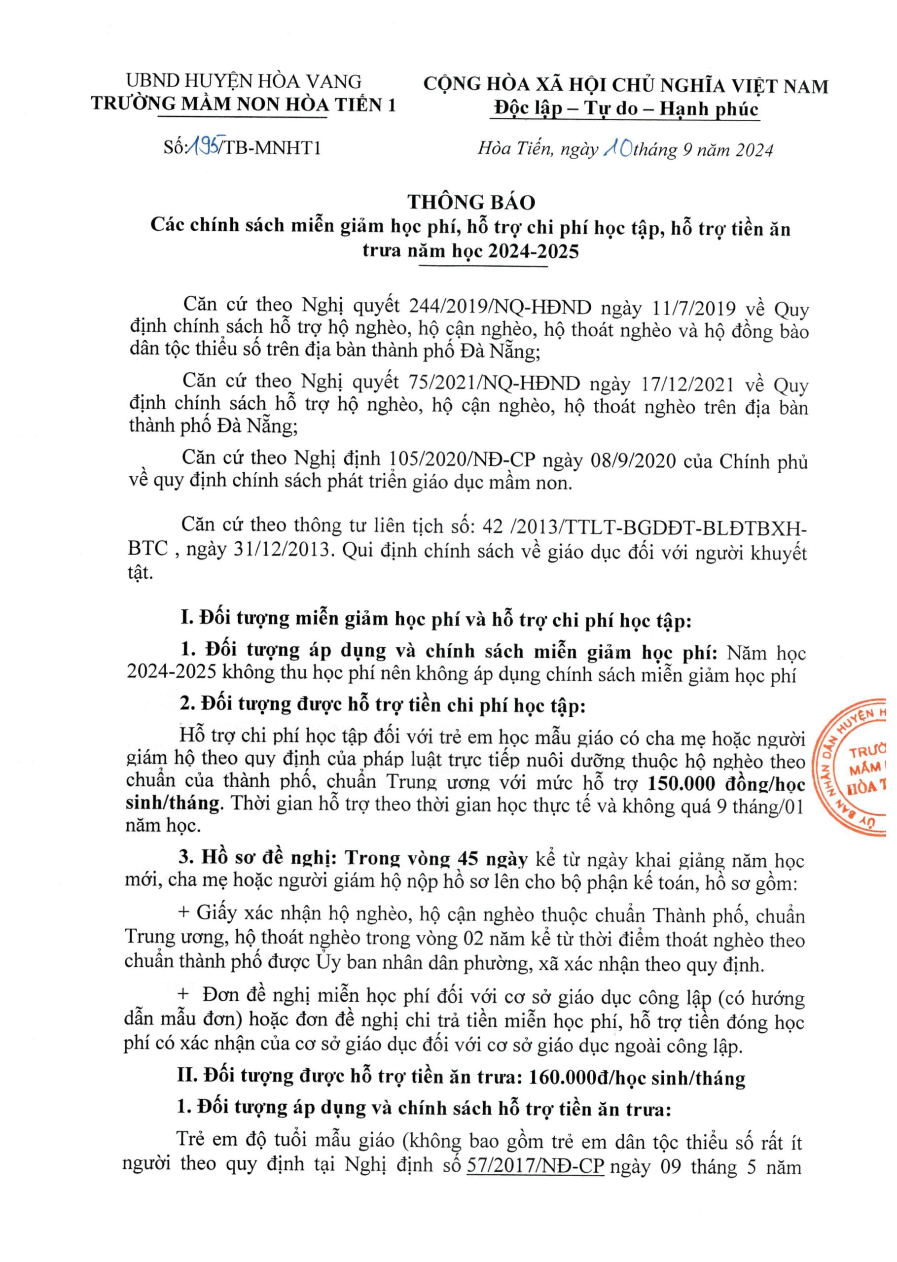 Thông báo các chính sách miễn giảm học phí, hỗ trợ chi phí học tập, hỗ trợ tiền ăn trưa năm học 2024-2025