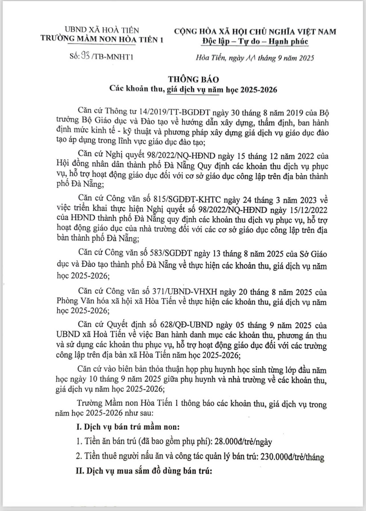 Thông báo các khoản thu, giá dịch vụ năm học 2025-2026