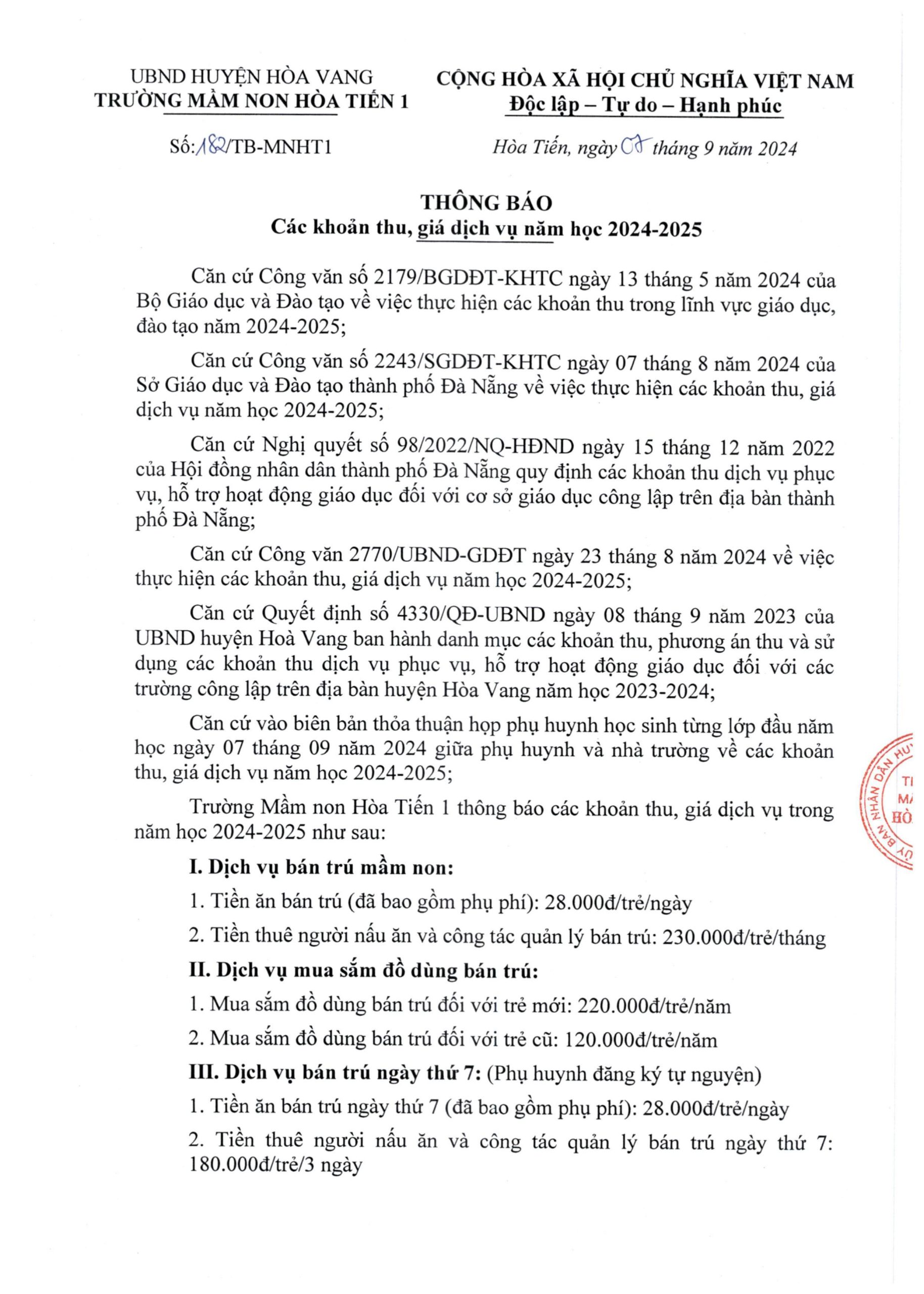 Thông báo khoản thu giá dịch vụ năm học 2024-2025
