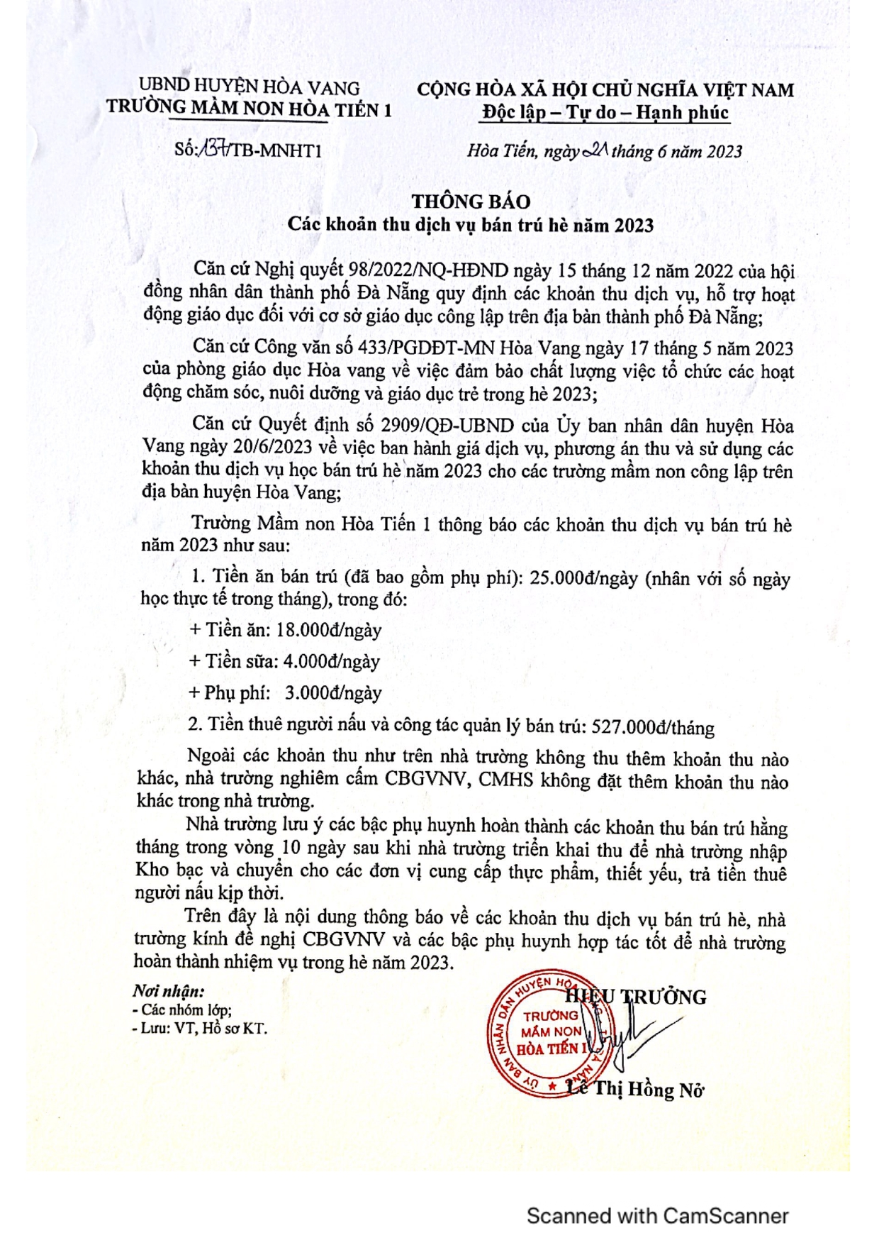THÔNG BÁO KHOẢN THU DỊCH VỤ BÁN TRÚ HÈ NĂM 2023